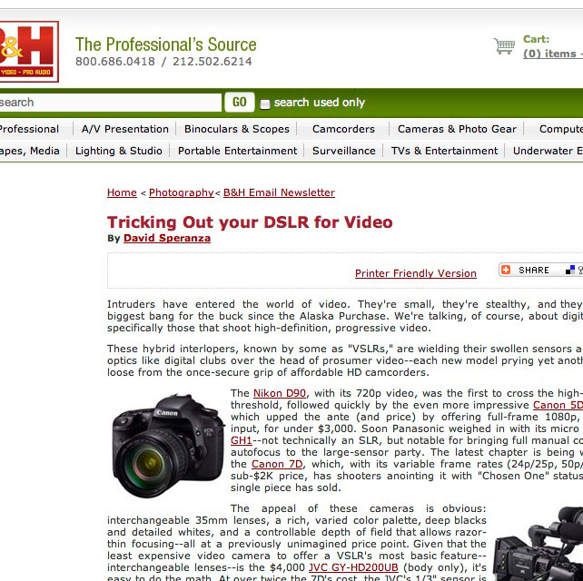 Rzecz o zastosowaniu aparatu fotograficznego jako kamery filmowej, a w zasadzie o możliwościach rozbudowy systemu i usprawnieniu pracy. Jak łatwo zauważyć –  taki Canon Eos 5D mk2 czy 7D (obecnie chyba najtańsza i do tego niezła opcja dobrego jakościowo FullHD) – były projektowane jako aparaty fotograficzne z funkcją filmowania jako dodatkiem. O ile stosowanie aparatu z popularnym obiektywem nie sprawia specjalnie kłopotu, o tyle zastosowanie np. jasnego teleobiektywu przez kilka godzin filmowania dziennie to już wyzwanie nie tylko dla naszego intelektu i zdolności twórczych…