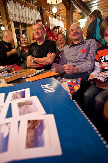 (niżej) Lokalna ekipa – Agata z Piotrem – czyli „ludzie ze Śnieżki”. Wyżej: Krzysztof Wielicki i Leszek Cichy – (ci dwaj panowie jako pierwsi na świecie weszli zimą na ośmiotysięcznik i od razu na Everest), Krzysztof Wielicki, Marek „Guma” Przeworski, znów Wielicki z Cichym, Bogdan Jankowski – ociera łzy, ze śmiechu…